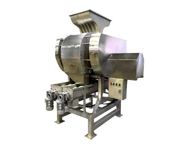 多功能压力机接通电源,将物料倒入进料口中,水果由进料斗进入压榨辊中间,压榨辊相向旋转,压榨辊表面有冲制成型的尖头,依靠尖头的摩擦力 ,将水果由压榨辊的中间间隙压入下部间隙,压榨辊下部中间位置安装有切半刀,水果在压榨辊和切半刀的作用下被切成两半,并在压榨辊的旋转带动下,分别进入两压榨辊与压辊下方弧形筛网的间隙中,此间隙从切半刀开始逐渐变小,因此水果在压榨辊的作用下通过时,受到挤压,将水果压榨出果汁,果汁由筛网孔流入接汁槽,从出汁口排出。弧形筛网可由切半刀调隙装置上下调节,从而控制水果的出汁量。弧形筛网两侧设有切分刀(切分刀可以上下调整,控制外皮和剩余果肉的比例),可将外皮和水果剩余果肉切分,剩余果肉进入带内过滤网的出渣螺旋输送机排出;刮皮刀讲压榨辊尖头上的外皮刮下,进入出皮螺旋输送机排出。